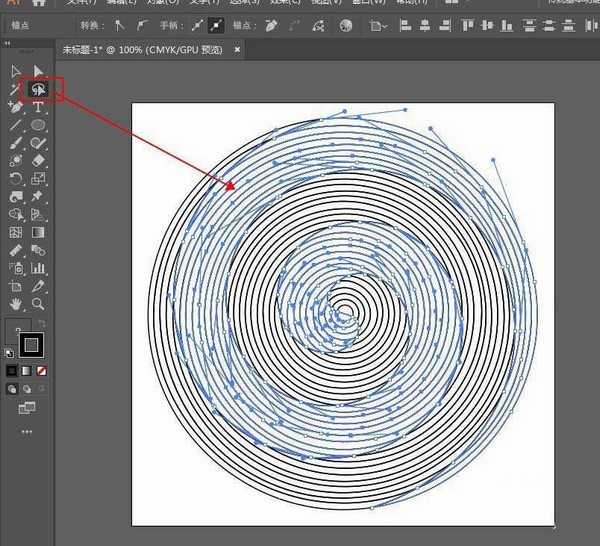 4、切换到旋转扭曲工具,将扭曲范围放大到正好盖住整个对象。单击左键,不放开,直到形成漩涡效果。