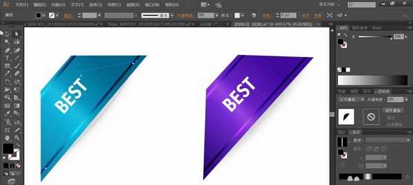 4、右侧的标签使用蓝紫色的渐变填充,文字使用白色填充,其它的填色方法与左侧标签相同,完成五边形异形标签的设计。