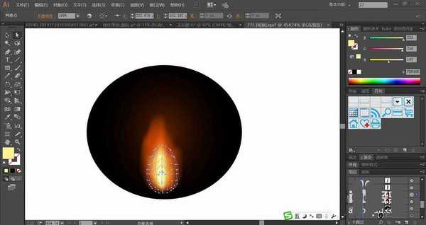 4、使用钢笔画出火苗的左侧、中间、右侧的轮廓路径并分别用红棕色与黄棕色填充,使用网格工具点击左侧与右侧的路径,让其呈现红褐色到黄色的渐变效果,中间的黄棕色路径设置成滤色模式,让高光呈现在火花上面。