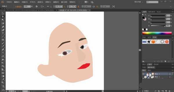 接着,我们使用网格工具给嘴巴做出红色渐变的效果,再给瞳孔做出灰黑色渐变的效果,眼白做出灰白色渐变的效果。绘制出女孩的头发轮廓并用暗黄棕色填充,在头发上面使用不同色调的相似色做出暗光效果。