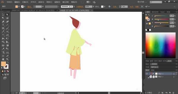 使用浅黄绿色填充女孩的上衣,用粉色填充女孩的手臂,使用粉红色填充女孩的裤子,再用浅黄绿色与浅蓝色搭配填充女孩的袜子与鞋子。