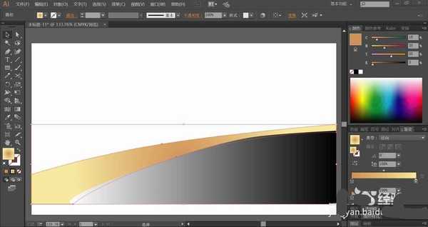 4、继续在图片的右侧画出远处的山体的路径与植物的路径,我们分别填充黄褐色的渐变与青绿色的渐变。