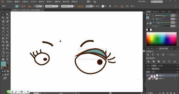 2、使用咖啡色描边线条路径,再用白色填充眼晴,瞳孔所在的圆形路径使用咖啡色填充,右侧眼晴的眼帘使用蓝灰色填充。眉毛也使用咖啡色描边呈现,在线条比例上更粗一些。