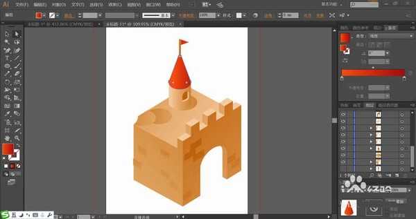 5、接着,我们用红棕色的渐变与黄棕色的渐变搭配填充旗帜与旗杆的路径。用同样的方法绘制出城堡左侧的尖顶结构建筑。