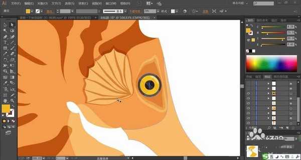5、接着,我们来画了海马的额头上的圆弧花纹,分别用黄灰色填充底部,用土黄色填充内部的线条。海马的眼晴外围用黄色填充,再用正片叠底模式的土黄色填充内部来加强暗光效果,眼晴本身用灰黑色与黄色搭配填充,制作一个高光效果在瞳孔上面,我们用滤色模式的黄色填充,透明度为20%左右。