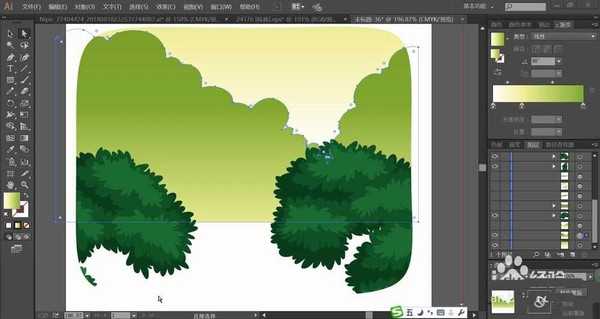 4、继续画出背景所在的天空的路径,我们用绿白色的渐变填充背景。继续使用绿白色的渐变填充背景的上面一层,设置正片叠底的模式,让其呈现一个远处山林的效果。
