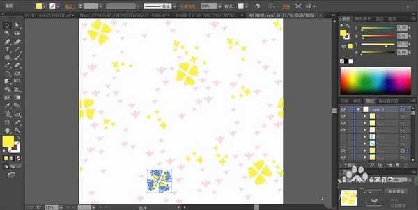 3、用淡黄色填充背景当中的小的三叶草,让其与粉红色的三叶草形成搭配,从而让背景呈现一种色彩变化之美,可以组合多个小的三叶草,再快速复制到整个背景当中。