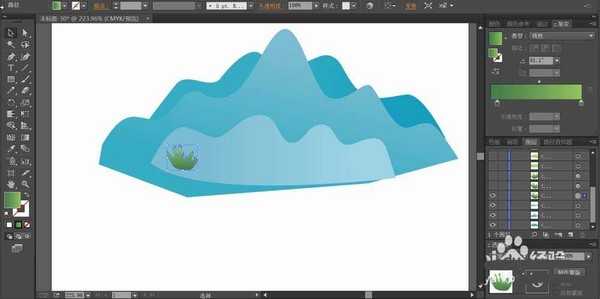 3、接着,我们用绿白色的渐变填充草地的路径,再用暗绿色的渐变填充草地上面的小树的路径。