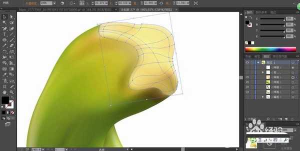 2、我们使用网格工具让辣椒的右侧上方呈现绿色到黄色的渐变效果,让辣椒的下方呈现深绿色的渐变效果。