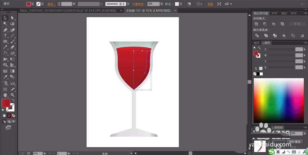 4、这一步使用钢笔画出饮品上面的冰块的路径并填充一个灰白色到透明的渐变,再用圆形画出饮品里面的气泡填充一个暗红色,上方的气泡填充一个亮红色。