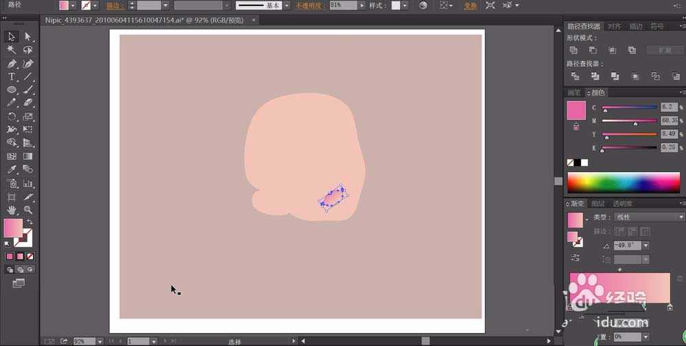 1、先使用矩形工具画出一个深粉色的背景,再使用钢笔工具画出一个脸蛋的路径,我们用淡粉色来填充。用钢笔画出少女的嘴巴的轮廓,我们用偏冷一些的粉红色的渐变填充,设置成透明度为75%左右的效果。