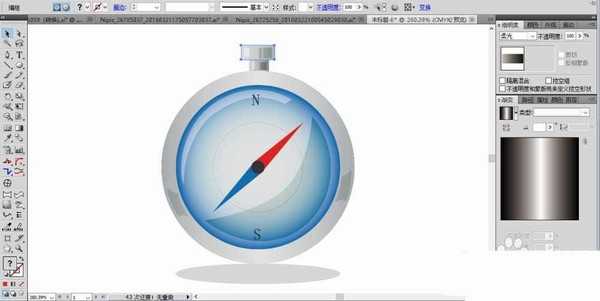 4、让指南针的外环也呈现出一种灰白色的钢材质效果。用钢笔工具画出指针的路径,我们用蓝色与红色搭配填充指针的两端,中间的圆形用灰黑色填充。