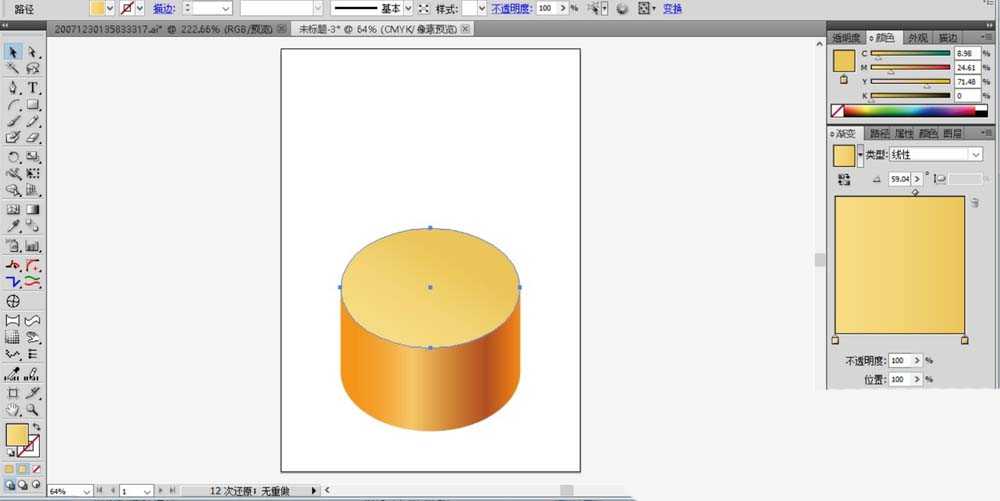 2、接着,我们再用一个圆形工具画出这个首饰盒所在的顶端截面,我们用土黄色的渐变填充在顶端的圆形。
