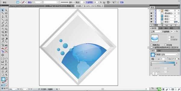 2、在四边形的右下侧画出一个圆弧并填充蓝色的渐变,在蓝色的圆弧上面绘制出一个白色的地图轮廓并用半透明的白色填充。
