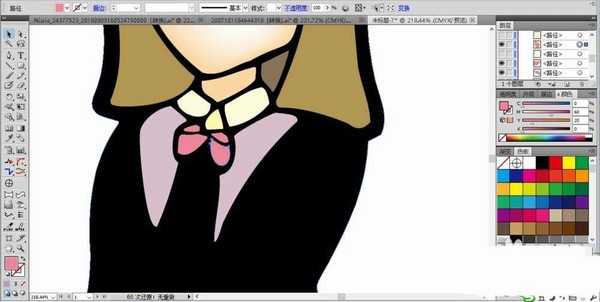 4、继续使用钢笔工具画出小公主的领子、领结等元素,我们用白色填充衬衣的衣领,用粉红色填充领结,用淡紫色填充大领口。