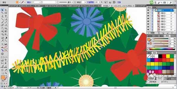 4、继续绘制面积较大的圣诞树的主体部分,更多的摆放各种的装饰元素并把飘带也进行复制与延伸来装饰圣诞树。