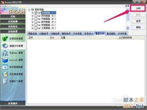 选择了磁盘过后,在下面窗口中,选择要对磁盘进行操作的功能选项,选择“重复文件”,如果此时按默认方法查找,可以立即按“分析”按钮进行查找。