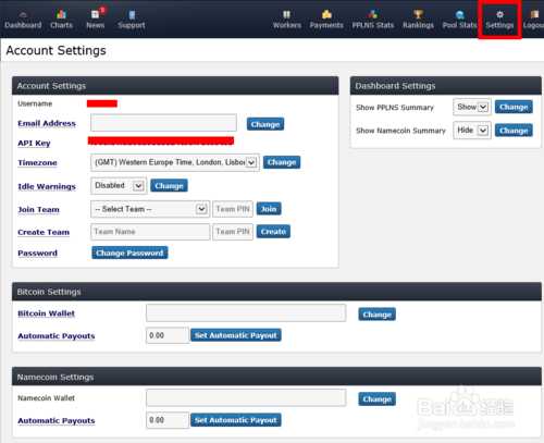 4、接下来请点击页面导航栏中的“Settings”。在设置页面中,我们可以设置电子邮件地,比特钱包地址,更改密码等,如图所示