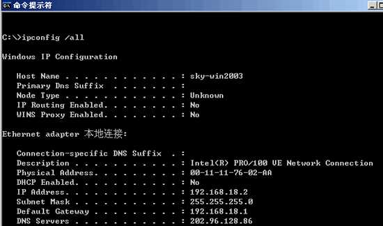 1. 使用ipconfig /all观察本地网络设置是否正确,如图;