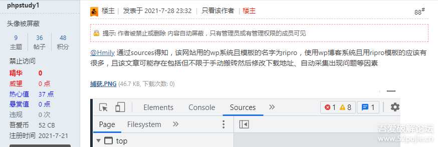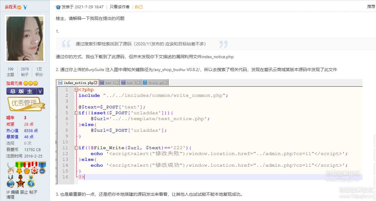 phpstudy1发布的原创帖子,实质是弄虚作假冒充原创,利用两份不一样的代码自导自演达到目的。后被热心技术坛友识破,经核实后,封号处理。