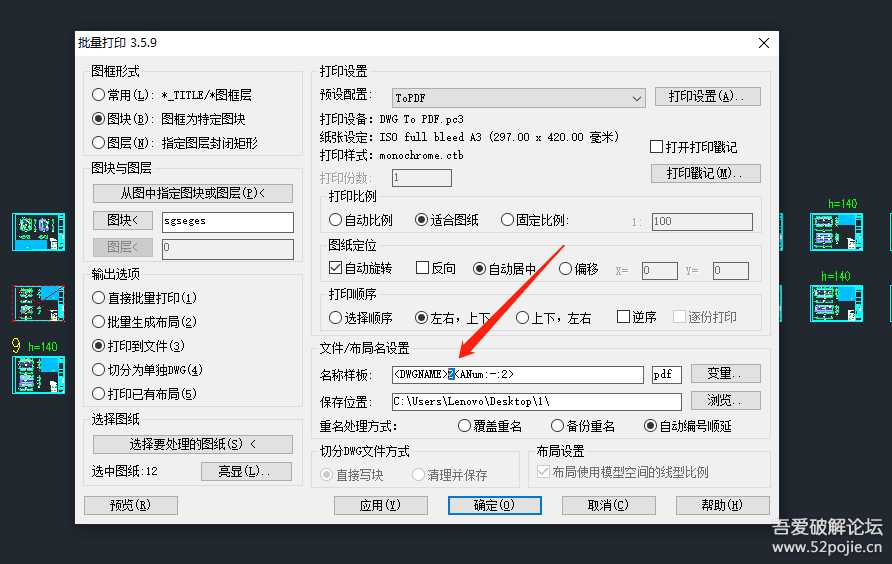 图块后面的框框会出来你刚刚选中的图框的块的名字,输出选项可以选择直接批量打印,但是图比较多还得按顺序,这里我选择打印到文件