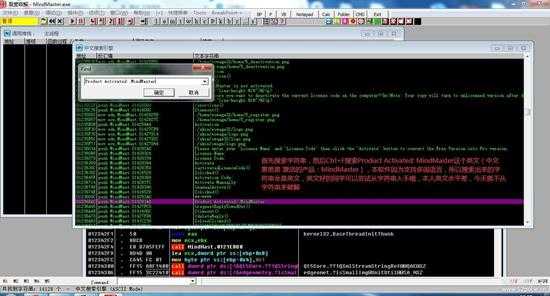 三、接下来我们开始破解,软件没有加壳,直接拖入OD进行分析(在此用的是吾爱专版OD),载入OD后搜索字符串,搜索到字符串之后Ctrl+F搜索“Product Activated: MindMaster”这个英文,中文意思是产品激活,这个软件搜索的字符串里面全是英文,本篇文章不从字符串入手(ps:对英文太菜)。英文好的同学可以从字符串入手哦,从字符串也是可以破解的。(如下图)