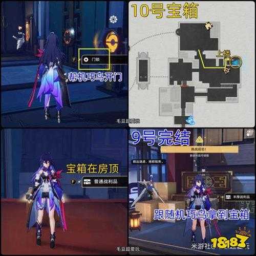 在护送机巧鸟的过程中需要帮它开门,打开门后我们直接朝地图右侧前进,顺着楼梯上楼,10号宝箱在房顶。之后再回来护送机巧鸟,拿到9号宝箱。