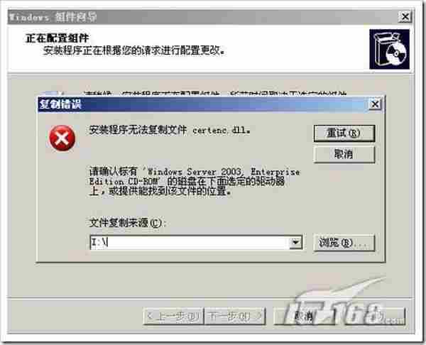 第十步:安装过程中会出现缺少文件的提示,我们需要将windows2003系统光盘插入光驱中才能继续。