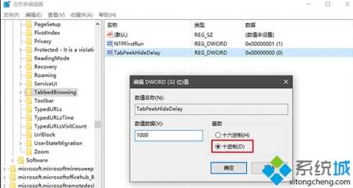 ② 双击后在数值数据输入时间值,要调整为“十进制”,如果你想让鼠标离开标签页后预览画面显示时间+1秒,就输入1000(如下图,再长就感觉像程序卡顿,当然想延长几秒大家随意……),然后点击“确定”后重启Edge浏览器生效。
