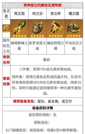 磐岩二件套增加15%岩元素伤害,战狂二件套加15%暴击率,再加上一件散件。选择圣遗物头部时,最好考虑武器副属性,选择增加暴击率或暴击伤害的属性;而圣遗物杯部最好选择增加岩元素加成的属性。