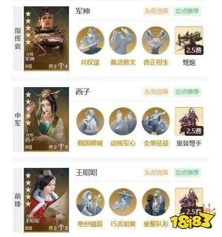 王昭昭自带技能绝世峨眉,能够让敌方在攻击女性武将的时候陷入混乱,而中军和前锋又是敌方攻击的主要目标,所以西子作为女性英雄也是能够和王昭昭打出配合效果。王昭昭带上巧舌如簧,能够使敌方强行攻击自己,触发绝世峨眉的混乱效果,重整队形则是提供一定的恢复能力。